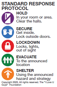 The SRP is a set of five simple, action-based responses that provide a common language for everyone—students, staff, parents, and first responders. By using the same terms, we can act quickly and predictably when it matters most.